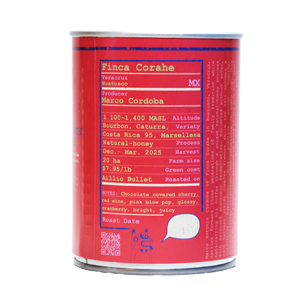 Marco Antonio Córdoba of Finca Corahe in Huatusco, Veracruz, carries forward three generations of family tradition while handcrafting his coffee through a unique natural-honey process with extended anaerobic fermentation. Sun-dried without water, each harvest yields complex flavors while the skin becomes a nutritious byproduct.